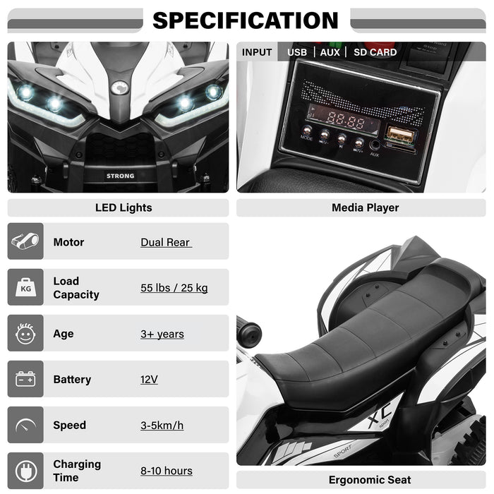 Alimenté par une batterie 12 V 4,5 Ah et deux puissants moteurs 390, votre enfant profitera jusqu'à 60 minutes de conduite passionnante. Sa conception allie performance et sécurité pour une tranquillité d'esprit optimale.
