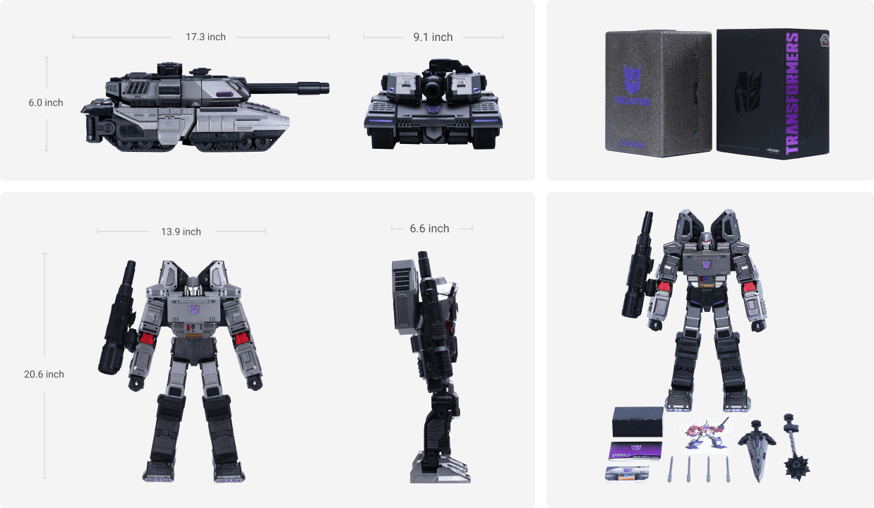 In collaboration with Hasbro – Megatron shines with its brilliant metallic finish and crafted from premium materials throughout. Integrated with industry defining technology, Megatron is powered by 36 servo-motors along with 118 microchips, which allow the Decepticon leader to walk, punch, and slash while in robot mode - or climb, pivot, and power through the enemy with the embedded track while in tank mode – making this the most authentic experience ever to launch!